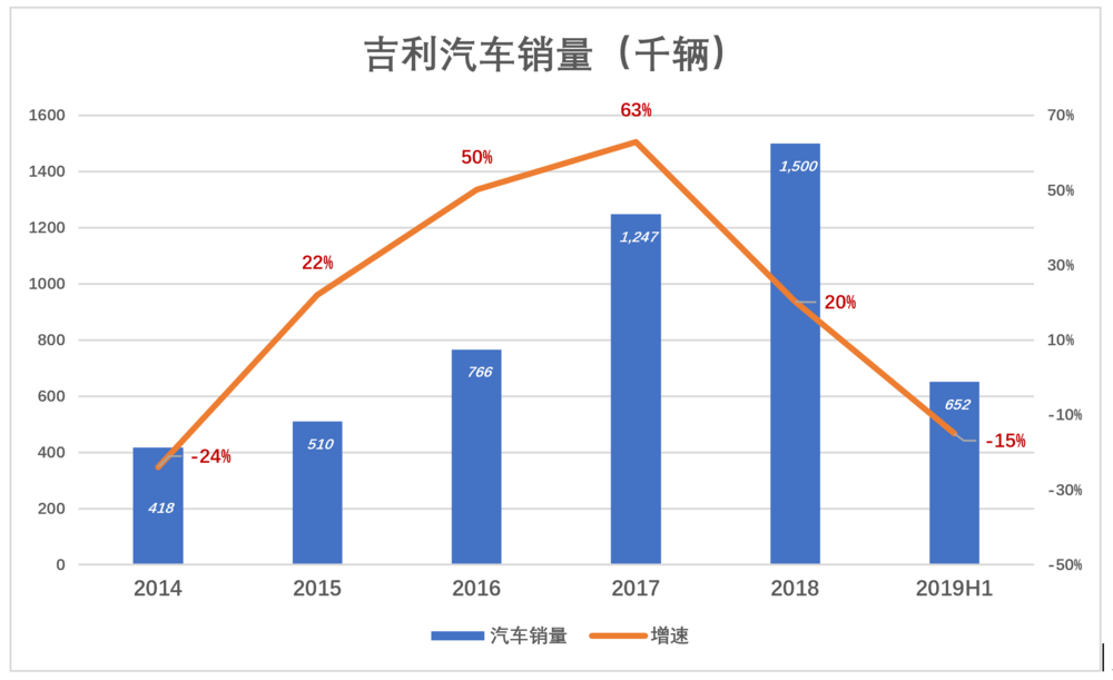 2019年H1,吉利汽车销量65万辆、同比减少15%。7月8日,吉利汽车发布业绩预警——2019年H1净利润将同比减少40%。此外,吉利汽车将2019年销售目标从151万辆下调到136万辆,较2018年减少9.3%。