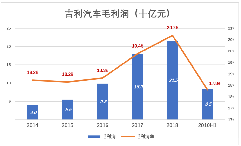 2018年吉利汽车销量达到创纪录的150万辆,毛利润率亦突破20%、金额达到215亿元。2019年H1,毛利润率大幅跌至17.8%,毛利润85亿元。