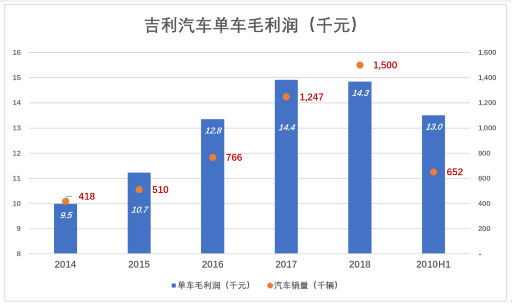 2014年吉利汽车毛利润率较2013年降了2个百分点,每卖一辆车只赚9500元。