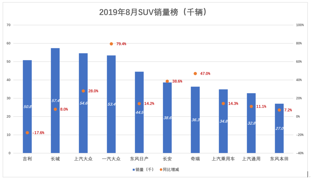 上汽大众、一汽大众在品牌、空间、配置、价格等维度对吉利构成强大压制,8月份销量均超越吉利,南北大众SUV车型单月销量逼近11万辆。