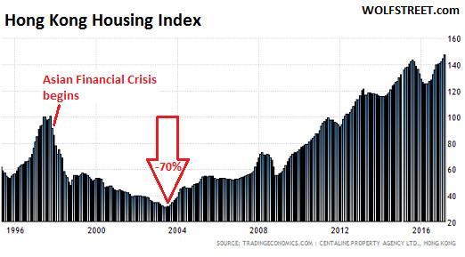 在1997年时,时任特首董建华在年度施政报告提出了八万五建屋计划,在1997年一年内,香港就有64400个住宅单位建成。但伴随亚洲金融风暴冲击,香港房价也在1997年见顶下跌,至1998年时香港房价在一年内腰斩,之后一直阴跌到2003年,累计跌幅达到70%。