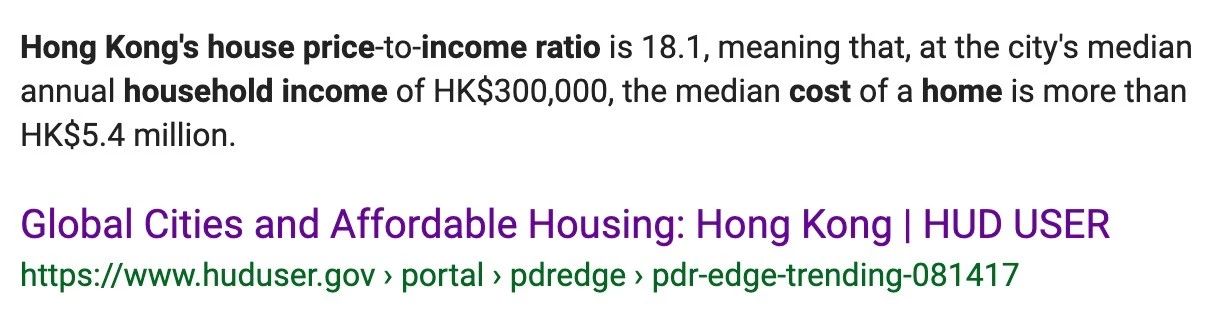 衡量房价的高低,主要看租售比和房价收入比。香港房价和国际上其他热点城市相比的确很高,但如果和内地城市(如北上广深)来看,上述两项指标早已被内地一线城市超越了。