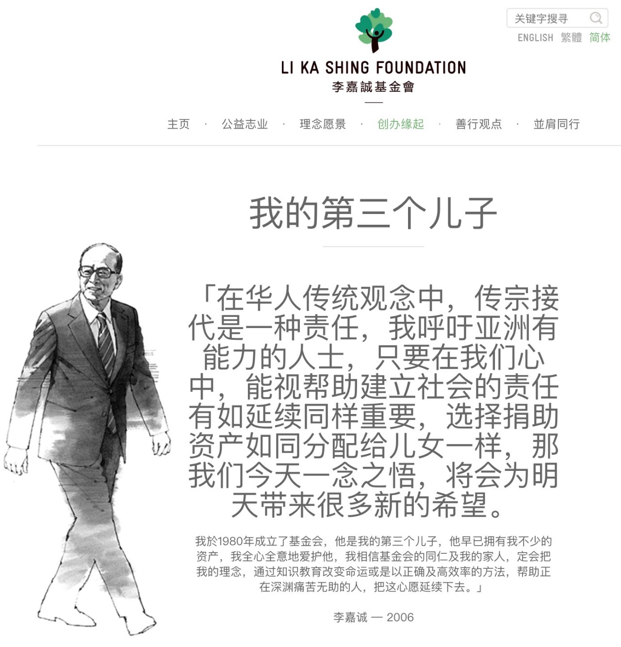 李嘉诚的精明商人形象背后,也是一个了不起的慈善家。他创立的李嘉诚基金会被他自己形容为“我的第三个儿子”,基金会以建立社会责任为己任,帮助正在深渊痛苦无助的人。