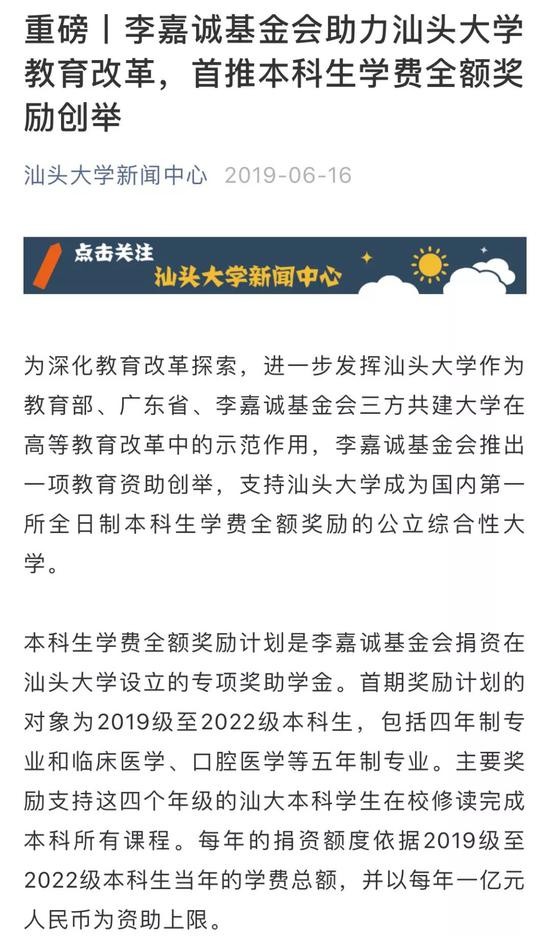 李嘉诚累计捐赠已超过150亿港元,是全球慈善做得最多的华人之一,他的大多数捐赠都投向了中国。李嘉诚非常关心教育事业,汕头大学就是李嘉诚基金会的一个杰作。