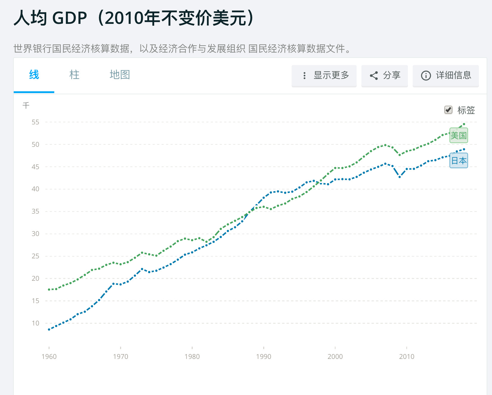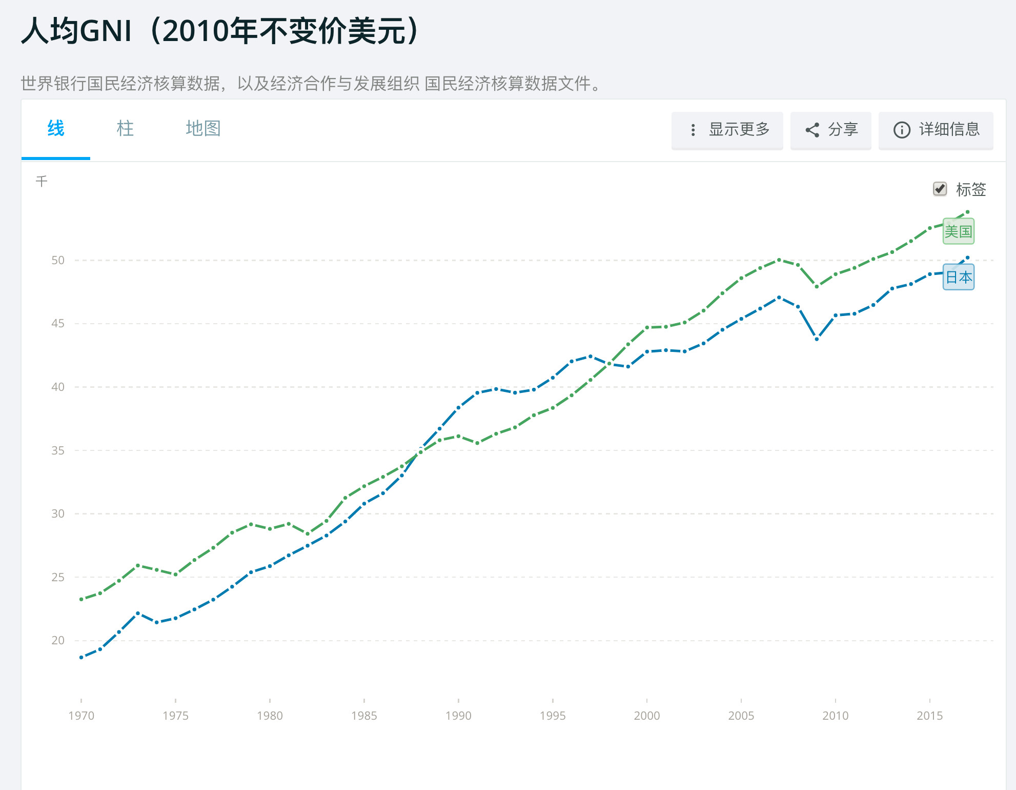 如果考虑到2018年底日本拥有3.17万亿美元的海外净资产,而美国海外净资产是负的。算下来日本的人均收入可能还更高一点!