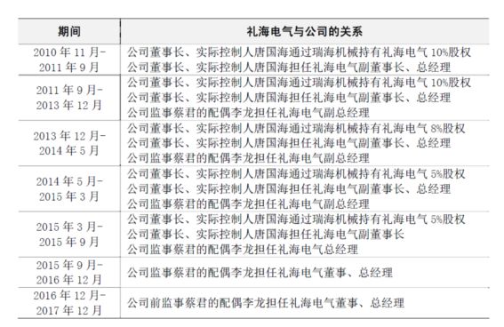 2.如果结合关联方的历史沿革和当时的一些政策背景,发行人与关联方的交易又是情有可原:①礼海电气是美国知名的一家企业与发行人实际控制人合资设立的一家公司,技术水平和产品品质是值得信赖的。②2010年设立时,实际控制人持有的股份是10%,但是根据当时的中国合作经营法的规定,实际控制人担任副董事长和总经理;③根据经营合同,三年后实际控制人将10%的股份按照约定分批转让给美国公司,不再持有股份,这是合同的约定。④股权转让之后,实际控制人也逐步退出合资企业的管理层。⑤发行人监事的配偶曾担任合资公司的副总经理,在2016年也退出。因而从2017年开始礼海电气不再是发行人的关联方。
