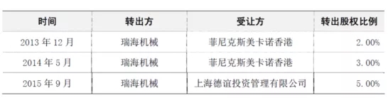 瑞海机械为唐国海100%控制的公司,即在礼海电气设立时唐国海间接持有礼海电气10%的股权。根据瑞海机械与菲尼克斯美卡诺香港2010年10月签订的《合作经营合同》约定,在2013 年12 月后,菲尼克斯美卡诺香港可收购瑞海机械持有的全部礼海电气股权,瑞海机械也可将全部股权转让给菲尼克斯美卡诺香港。故根据《合作经营合同》的约定及礼海电气实际生产经营情况,自2013年12月至2015年9月期间,瑞海机械分三次将其持有的礼海电气共计10%股权转让给菲尼克斯美卡诺香港(2%、3%)和上海德谊(5%),具体情况如下: