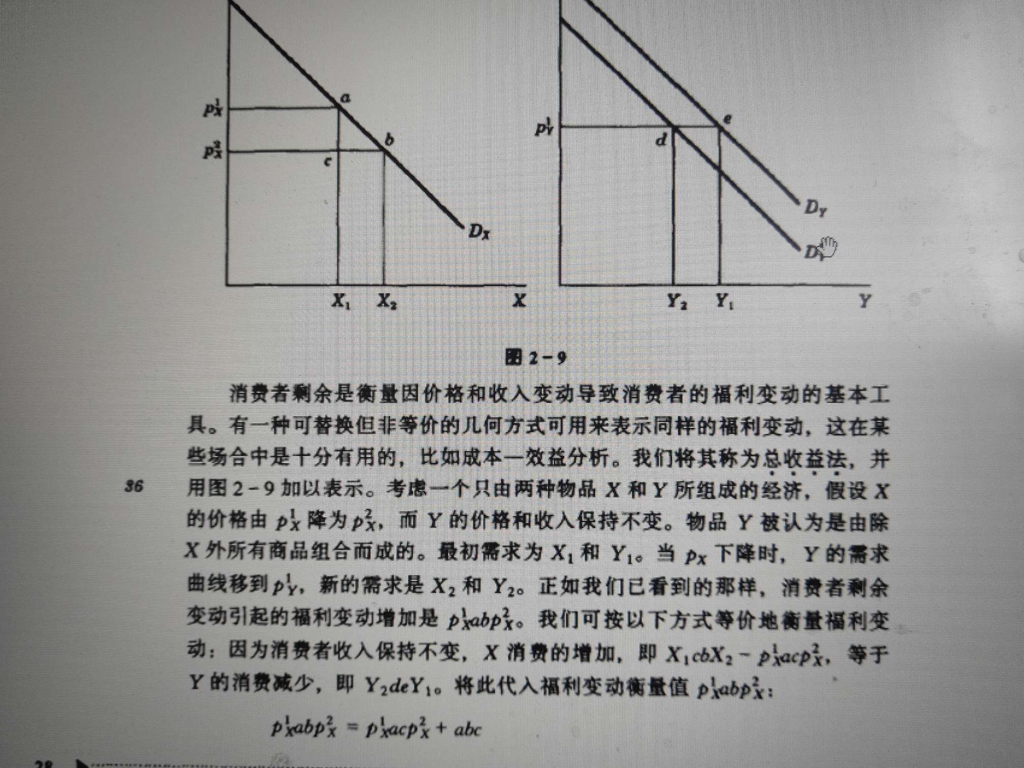 如图所示在总收益法中,x商品价格由p1到p2,说消费者剩余变动引起的福利变动是p1xabp2x,这是不是只考虑了x商品的消费者剩余?y商品不是由于需求曲线左移,导致消费者福利减小了吗?