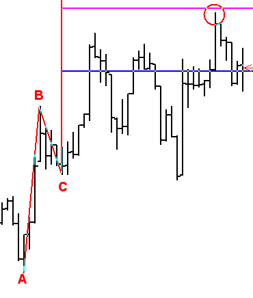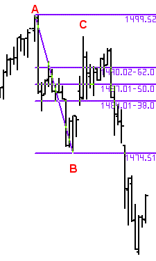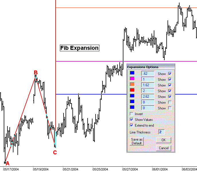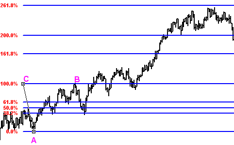 MetaStock allows you to connect two points, not three, in drawing Fib Price Expansions. You can still connect multiple pivots and find it to be a useful technique. Note: to use the clustering technique first connect alow to a high - the traditional approach - then connect a low to the next low. Many MetaStock users are unaware that the Fib Retracement drawing tool can beused to draw Fib Price Expansions. To draw a Fib Retracement you'd connect A to B (see below). To draw the Expansion while drawing move the mouse cursor to the left of A (point C, which is any place to the left of A) and the expansion lines will draw. Once drawn you can right-click any of the lines and select"Properties" to set which Fib Levels you want to use, plus you canadd your own levels.