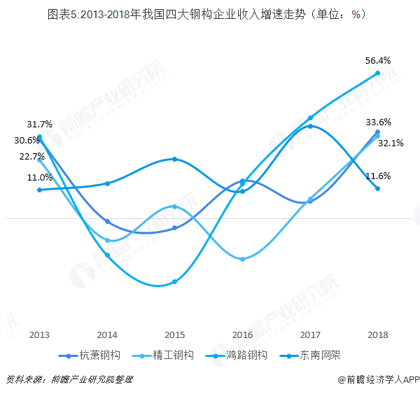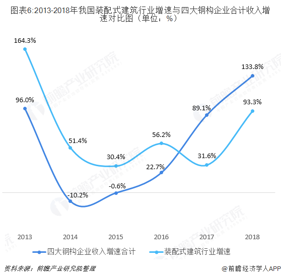 尽管我国装配式建筑行业发展迅速,但钢结构行业受益似乎并不明显,主要钢结构上市企业杭萧钢构、精工钢构、鸿路钢构、东南网架2013-2018年收入CAGR分别为9.2%、2.8%、9.8%、18.5%远慢于装配式建筑面积、行业规模同期增速(93.3%、133.8%)。前瞻产业研究院认为2019年以前装配式建筑行业红利主要由市场主流PC结构享受。