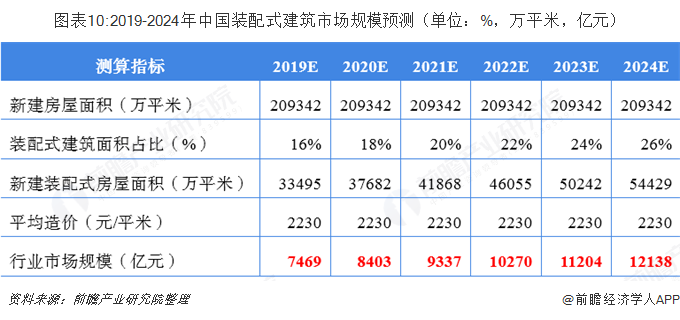 根据国家装配式建筑发展目标,2020年,我国装配式建筑占新建建筑面积的比例达到15%,2025年达到30%,2018年我国装配式建筑占比约为14%,则未来近年平均每年提升2个百分点。根据住建部发布的装配式建筑造价参考依据,以2230元/平方米(考虑到技术水平上升和物价提高对价格水平带来的不同影响,假设未来几年造价不变)为基础,以房地产新建建筑面积替代城镇新建建筑面积进行测算,及至2024年我国装配式建筑市场规模将达到12000亿元以上。