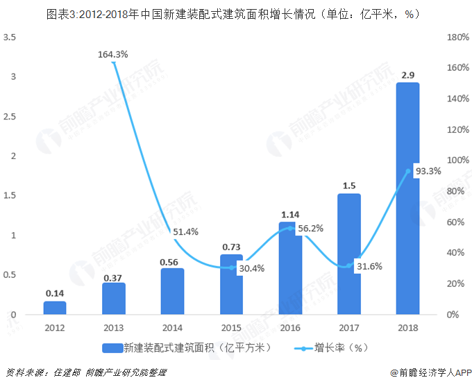 住建部数据显示,2012-2018年中国新建装配式建筑面积呈高速增长趋势。2018年中国新建装配式建筑面积为近6年来最大值,达到2.9亿平米,同比增长93.3%。