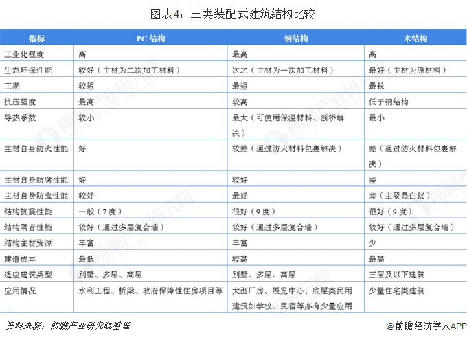 产品结构方面,国内装配式建筑构件主要为预制混凝土(PC)结构、钢结构和木结构,三类构件各具优劣。我国装配式建筑PC结构应用最多,集中应用于水利工程、桥梁等建筑,过去作为试点的保障性住房亦大多使用PC结构,PC结构在三类构架中强度最好、防火/防腐性能最出色。钢结构应用集中于公共建筑/工业建筑,三类构件中具备工业化程度最高、抗震性能出色、结构灵活得房率最高等优点。木结构环保性能出色但建造成本高,应用最少。