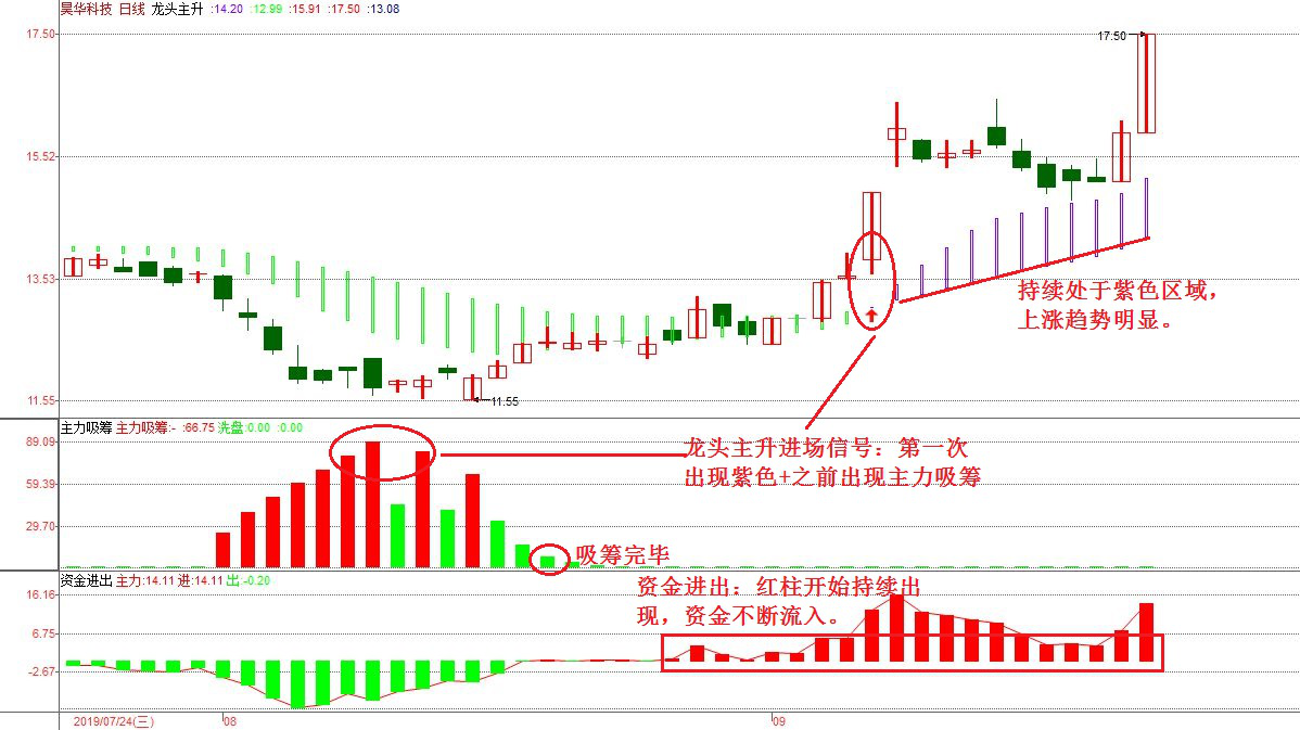 智能指标详解:龙头主升—先吸筹,后主升(紫色:代表中线上涨,第一个紫色信号通常是进场信号;绿色:代表空头下跌,第一个绿色信号通常是出场信号;配合:主力吸筹模型—一个月内有主力吸筹信号!)