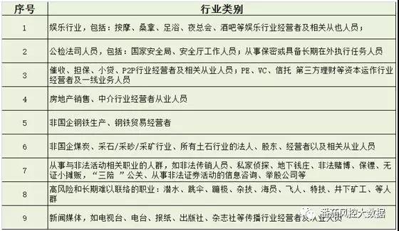 在黑名单外,有些公司还会将客户涉及的行业也做成相关的拒绝类规则。行业类别,就是我们筛选客群的标准,比如什么类型的客群是准入客群,什么类似的客群能作为目标客户,目前在业内比较相通的行业拒绝类别如下,一份目前在业内流传较广的禁入职业如下: