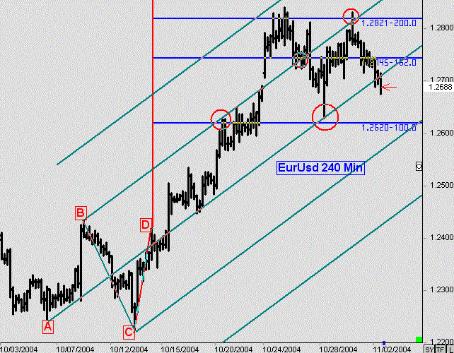 Below I drew a pitchfork using A-B-C. I drew a Fib Price Expansion using C-D. The red-circles are those times when price was near a pitchfork line and Fib Expansion level. The levels to use are .62, .50, and1.0, 1.62, 2.0, and 2.62 percent. When the first wave is large (the distancefrom C - D) you can start with .38 percent. Each red circle represents a time when price was very close to an intersect of a Pitchfork line and a Fib Level.
