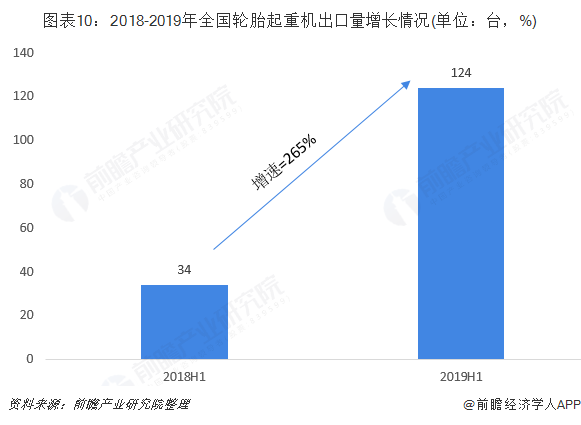 目前,轮胎起重机是我国起重机设备中最小的一类,销售占比还不足1%。近年来,随着徐工自主研发轮胎起重机的成功,其轮胎起重机普及度就不断提升,2019年1-6月,累计售143台,同比增加64台,增长81%,市场需求主要靠出口市场拉动。