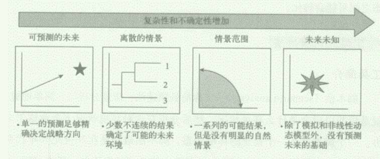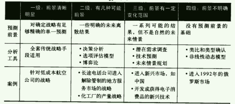 商业环境有四个不确定性的层级,每个层级决定可能的未来环境的分析工具各有不同。