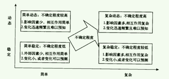 如果企业面临的环境要素是变化的,则称之为动态环境;如果各要素相对稳定,变化很小或者变化是可以预知的,则称之为稳态环境。复杂性是衡量环境中影响企业的因素的数量,因素之间相互影响的复杂程度,以及企业为应对这些因素的影响所需要具备的能力的强弱和知识的广度与深度。如果因素多且相互作用,企业需要很强的能力才能应对,则称之为复杂环境;如果因素少,企业掌握较少的知识,具备一般能力就能应对的,则称之为简单环境。