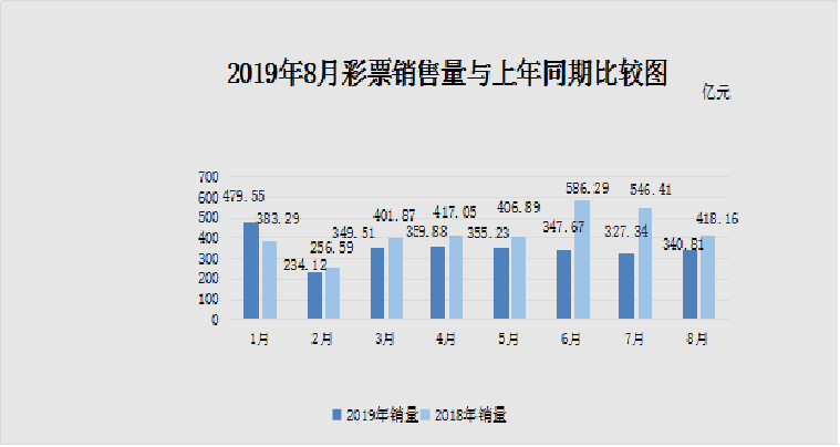 8月份,全国共销售彩票340.81亿元,比上年同期(简称“同比”)减少77.35亿元,下降18.5%。其中,福利彩票机构销售146.06亿元,同比减少31.78亿元,下降17.9%;体育彩票机构销售194.76亿元,同比减少45.57亿元,下降19.0%。