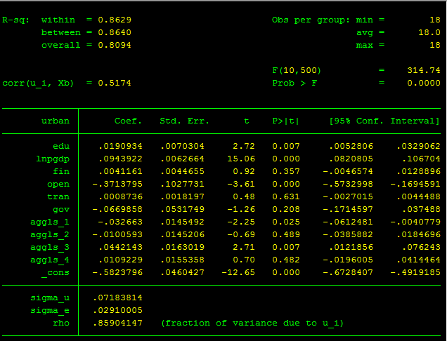 xtthres urban edu lnpgdp fin open tran gov,thres(edu) dthres(aggls) min(10) bs1(400) bs2(400) bs3(400)