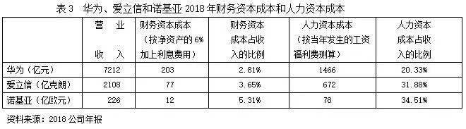 表3列示了华为及其主要竞争对手爱立信和诺基亚2018年的财务资本成本和人力资本成本及其占营业收入的比例。从表中可以看出,这三大电信设备制造商的人力资本成本远超其财务资本成本,可见,它们最重要的投入要素是人力资本,而非财务资本。