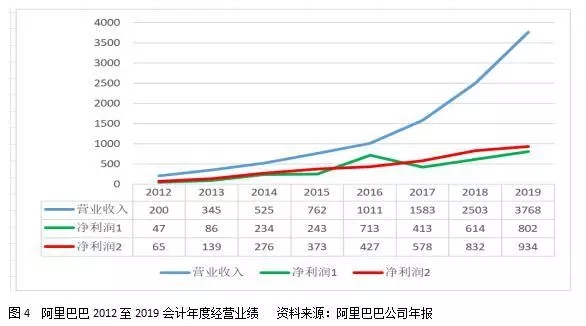 同时披露遵循准则的业绩和背离准则的业绩,在上市公司中越来越普遍。图4列示了阿里巴巴过去8年的经营业绩指标,从中可以看出,背离会计准则的盈利曲线(净利润2,剔除了与经营无关且没有现金流入流出的损益项目)与其营业收入曲线的拟合度更高,表明背离会计准则比遵循会计准则(净利润1)能够更加真实地反映其经营业绩。