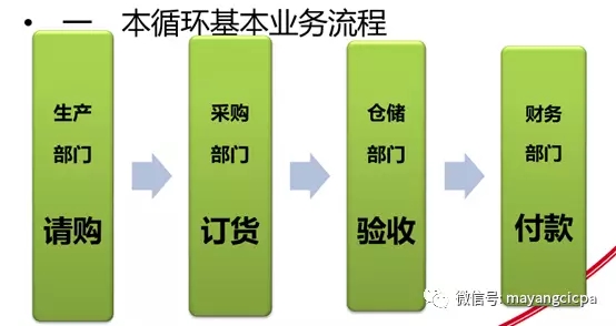一般来说,生产型企业的采购与付款循环应至少涉及以下四个部门,生产部门、采购部门、仓储部门、财务部门,对应的业务流程分别为请购、订货、验收、付款,如下图所示:
