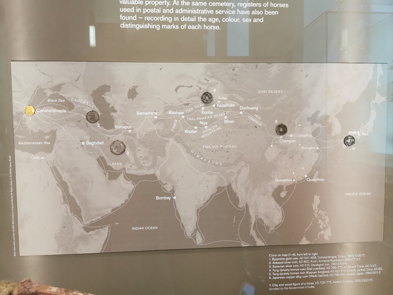 在大英博物馆的中国馆按编年史记载了从史前文明到现代中国的历史变迁,其中丝绸之路的货币流通的图片很有意思。图中展现了自西向东,拜占庭帝国的金币,到波斯帝国的萨珊银币,到唐朝的开元通宝、大历通宝,再启发了日本发行了最早的和同开珎。在边境地带则往往是两种货币通用的状态,甚至于盛唐时期自西向东沿着丝绸之路都能看到开元通宝的影子。