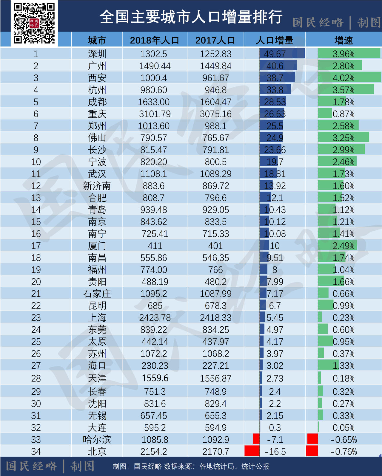 2018年,全国人口增量超过10万的城市分别为:深圳、广州、西安、杭州、成都、重庆、郑州、佛山、长沙、宁波、武汉、济南、合肥、青岛、南京、南宁、厦门。