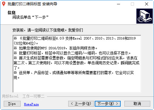 1.《批量打印二维码标签6.0》支持Excel 2007、2010、2013、2016和2019(32位和64位)。还支持WPS 2016/2019。