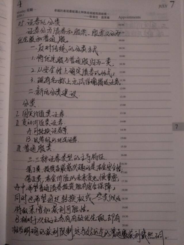 人们习惯了按照法律关系和安全性来划分证券,从而有了债券,股票(优先股和普通股)。教授在书中向我们传授了另外一种思路,更加综合的想法,本金安全,有相对强保障的本金波动,有较弱保障的本金波动以及本金波动证券。尽管出发点在质上是一致的,但这就像是我想买一辆车和我想买一辆二十万左右、大众银灰色三箱轿车一样,有了可操作性。