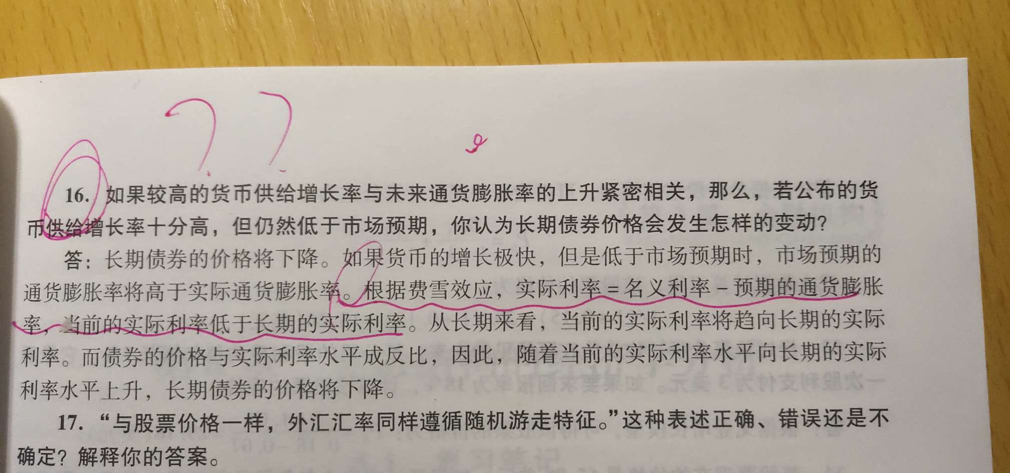 但本人的理解是题目中已经说了公布的货币增长率虽然高,但低于预期增长率,那意思就是实际通胀低于预期通胀,那不应该是预期向实际靠拢吗??就是远期向当前通胀靠拢,那通胀的下降应该导致债券价格的上升啊??真的不理解。。。。。
