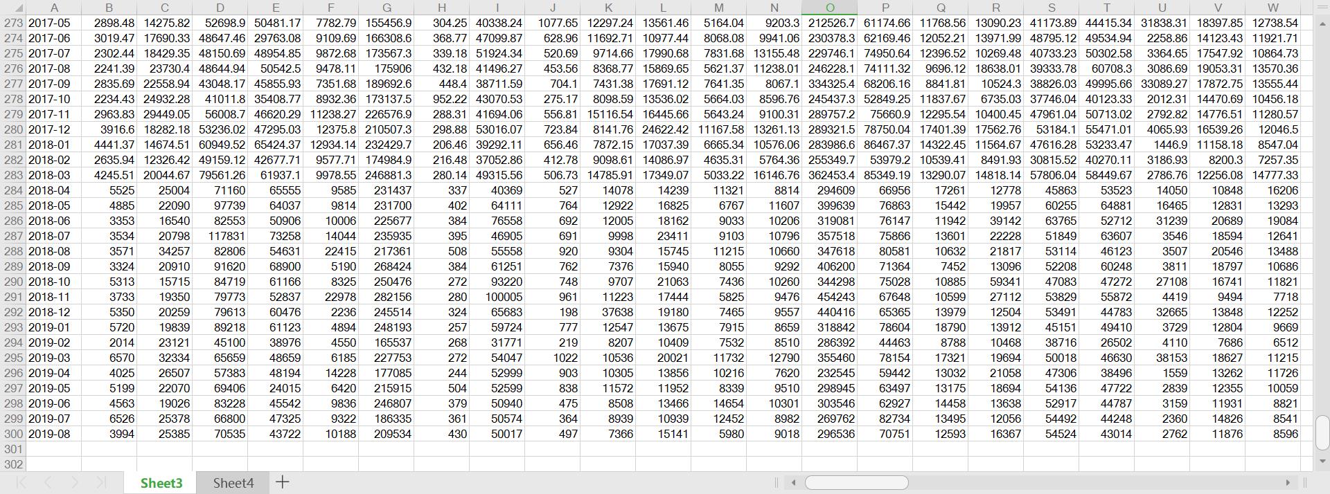 这个是中国月度进出口数据,数据来源于海关总署,时间为1995年1月-2019年8月,主要有约44个国家和地区,分别为缅甸、中国香港、印度、印度尼西亚、伊朗、日本、中国澳门、马来西亚、阿曼、巴基斯坦、菲律宾、沙特阿拉伯、新加坡、韩国、泰国、土耳其、阿联酋、越南、中国台湾、哈萨克斯坦、南非、比利时、丹麦、英国、德国、法国、意大利、荷兰、西班牙、奥地利、芬兰、罗马尼亚、瑞典、瑞士、俄罗斯、乌克兰、阿根廷、巴西、智利、加拿大、美国、澳大利亚、新西兰、欧盟。变量有出口额和进口额,分为当期值和累计值,可以将月度数据转换成季度数据和年度数据,数据为HS分类,为第六类的HS28章-HS38章,HS第六类主要为化学工业及其相关工业的产品。HS28:无机化学品;贵金属、稀土金属、放射性元素及其同位素的有机及无机化合物。HS29:有机化学品。HS30:药品。HS31:肥料。HS32:鞣料浸膏及染料浸膏;鞣酸及其衍生物;染料、颜料及其他着色料;油漆及清漆;油灰及其他胶粘剂;墨水、油墨。HS33:精油及香膏;芳香料制品及化妆盥洗品。HS34:肥皂、有机表面活性剂、洗涤剂、润滑剂、人造蜡、调制蜡、光洁剂、蜡烛及类似品、塑型用膏、"牙科用蜡"及牙科用熟石膏制剂。HS35:蛋白类物质;改性淀粉;胶;酶。HS36:炸药;烟火制品;火柴;引火合金;易燃材料制品。HS37:照相及电影用品。HS38:杂项化学产品。具体分类可以查看百度HS分类。丰富细致的数据极大地方便了我们的研究,有兴趣的朋友们可以下载来做研究之用,