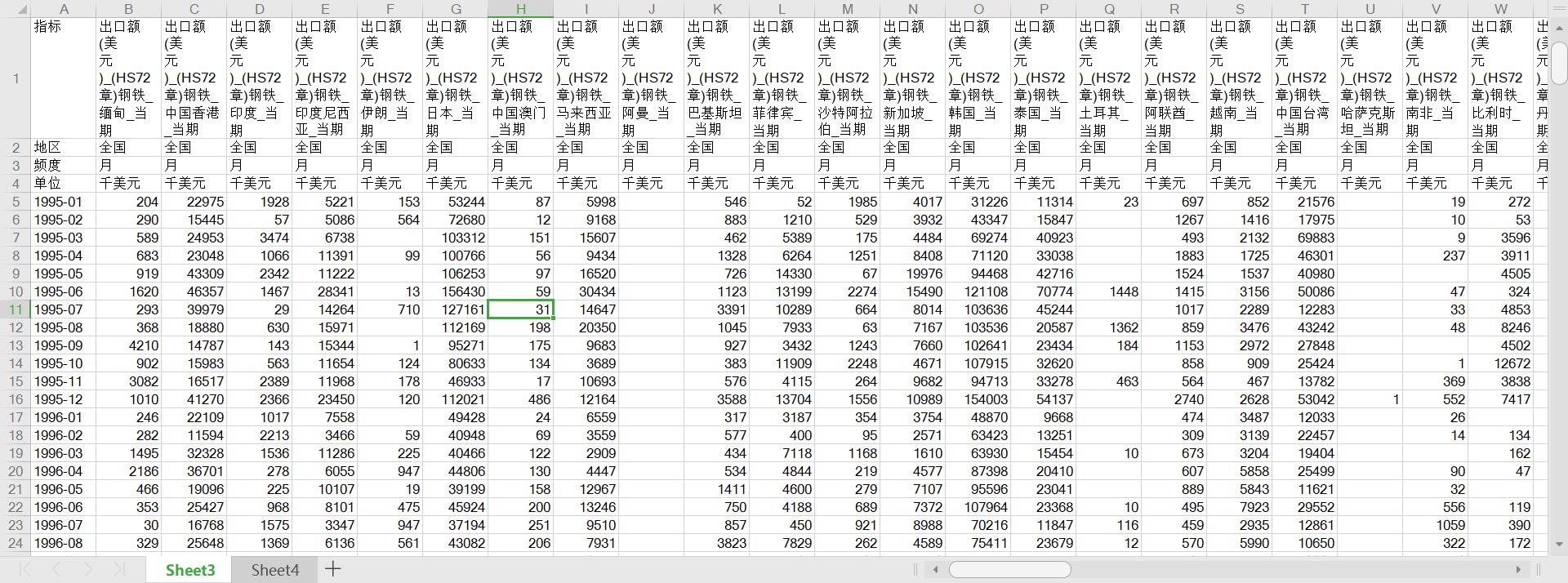这个是中国进出口数据,月度数据,数据来源于海关总署,时间为1995年1月-2019年8月,主要有约44个国家和地区,分别为缅甸、中国香港、印度、印度尼西亚、伊朗、日本、中国澳门、马来西亚、阿曼、巴基斯坦、菲律宾、沙特阿拉伯、新加坡、韩国、泰国、土耳其、阿联酋、越南、中国台湾、哈萨克斯坦、南非、比利时、丹麦、英国、德国、法国、意大利、荷兰、西班牙、奥地利、芬兰、罗马尼亚、瑞典、瑞士、俄罗斯、乌克兰、阿根廷、巴西、智利、加拿大、美国、澳大利亚、新西兰、欧盟。变量有出口额和进口额,分为当期值和累计值,可以将月度数据转换成季度数据和年度数据,数据为HS分类第十五类:贱金属及其制品,HS72-HS83章,HS77章没有(保留为税则将来所用)。HS72:钢铁。HS73:钢铁制品。HS74:铜及其制品。HS75:镍及其制品。HS76:铝及其制品。HS78:铅及其制品。HS79:锌及其制品。HS80:锡及其制品。HS81:其他贱金属、金属陶瓷及其制品。HS82:贱金属工具、器具、利口器、餐匙、餐叉及其零件。HS83:贱金属杂项制品。具体分类可以查看百度HS分类。丰富细致的数据极大地方便了我们的研究,