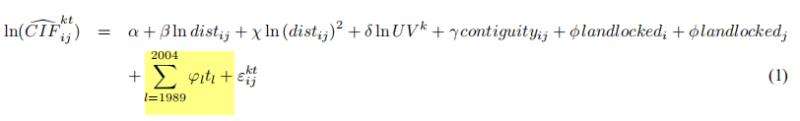 这是一个贸易重力模型中是一个模型,1989和2004是年份,那这一部分表示的是什么意思呢,求指点