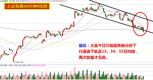 结论:大盘今日已缩量跌破分时下行通道下轨及13、34、55日均线,再次放量才见底。