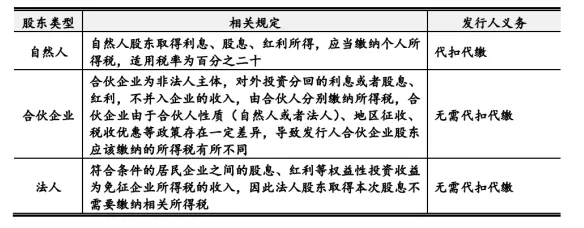 发行人的股东可以分为自然人、法人以及合伙企业。根据相关税收法律法规,发行人对于自然人股东个税负有代扣代缴义务,对于合伙企业及法人股东的相关税款不负有代扣代缴义务。关于股利分配缴税的相关规定情况如下: