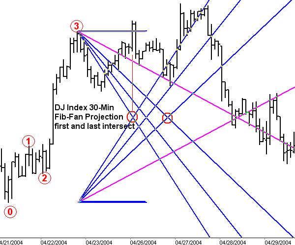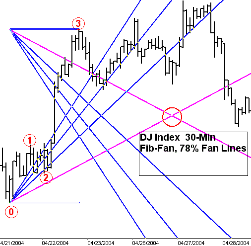 The below chart is also a 30-min DJ index chart, about a week after the above chart. Before we move the fan-lines forward note the intersect of the (magenta) 78% lines, which are timing a turning-point nicely. Also, the intersect of the 78% and 62% lines are timing a turning-point, as in all three examples.