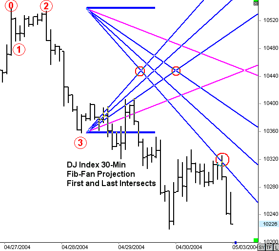 Below the two fans have been moved forward as described in the Drawing section. The blue lines are the "traditional" fan lines of 38%, 50% and 62%. You are interested in the first two red circles, which show the intersects of the 38% lines (the first circle) and the 62% lines (the second circle). These often time the start and end of a short-term swing. The third circle (the 78% intersects) isn't as relevant - usually you will have new pivots in place and will have redrawn this technique. I have found the projected 78% line to be a nice profit-objective when the three traditional fan-lines aren't supporting price.