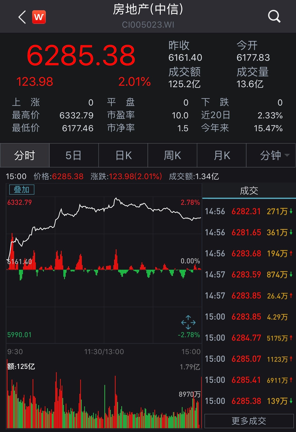 昨日收盘,房地产行业涨逾2%,在中信29个一级行业中涨幅排名第三,成交金额125.16亿元,板块中超六成个股上涨。