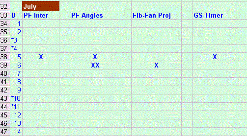 Below its set for the month of July, with the rows being days and the columns being our techniques. You'd have one for each market you trade. A day is preceded with an asterisk if it's a weekend (sometimes signals are between two price-bars). An "X" is placed if you have asignal for that day. This would be the best situation possible - each timer giving a signal within a day of each other, with no signals before or after.Note that PF-Angles has 2 X's - that's because for any chart you can usually draw 2 or more of any of these techniques. Using different pivots it's possible(for example) that the second intersect of the first PF-Angles falls on the same day as the first intersect of the second PF-Angles drawing. Of course these are just recommendations - you can structure the appearance anyway you see fit. The idea is that you can spot trend-change clusters easily.