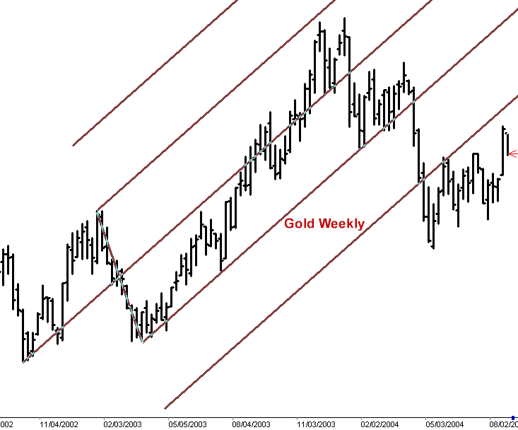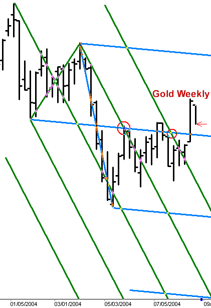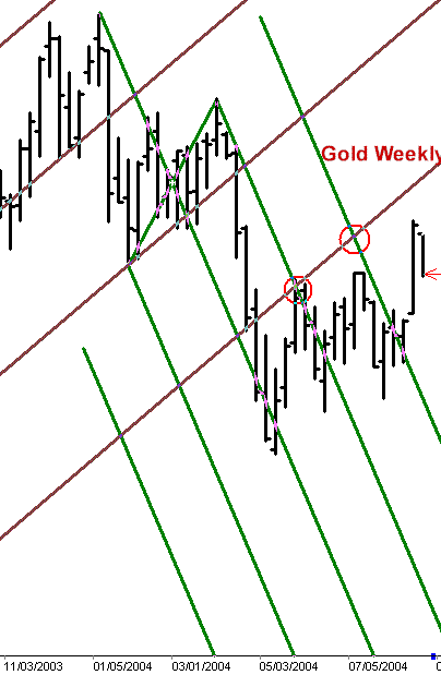 A basic premise of market geometry is that the more significant the pivot we use, the less market noise we incorporate in our drawings. Supporting this it's often easier to spot significant pivots on higher timeframes. Weekly charts illustrate this very well. While we may be concerned that the time-zones are too wide, you can narrow the entry time by using the Timing Matrix. On weekly charts, I find the Pitchfork Intersect technique to work exceptionally well. Using weekly Gold as an example, let's just look at a Pitchfork by itself.