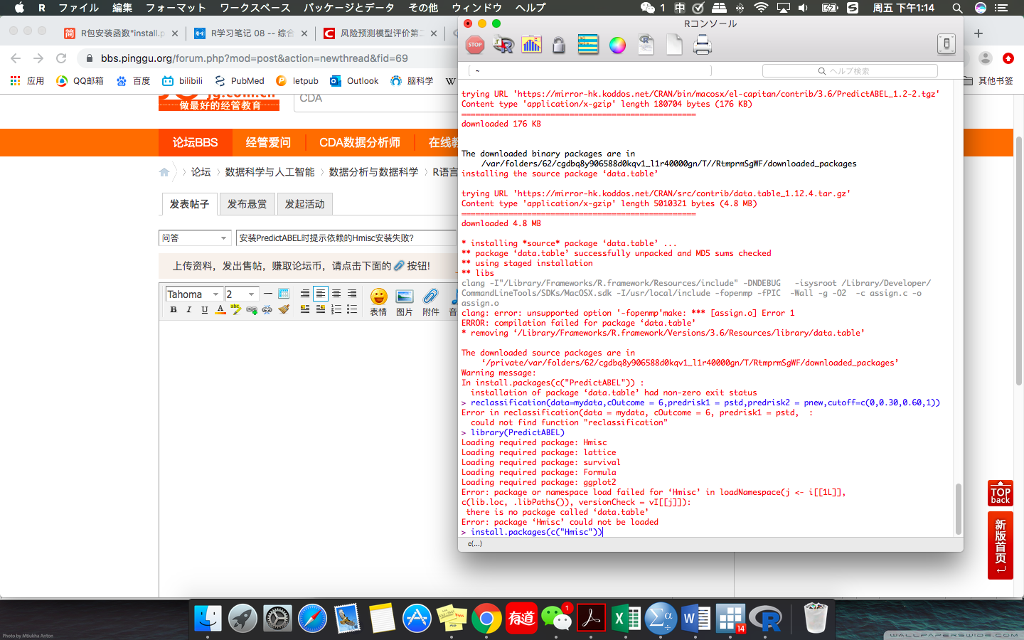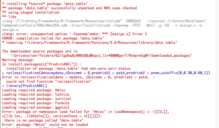 按照说明安装PredictABEL包的时候有一个依赖的Hmisc包也要安装,但是看它的输出好像是提示Hmisc里面的data.table安装不上?不知道是什么原因,怎么处理呢?