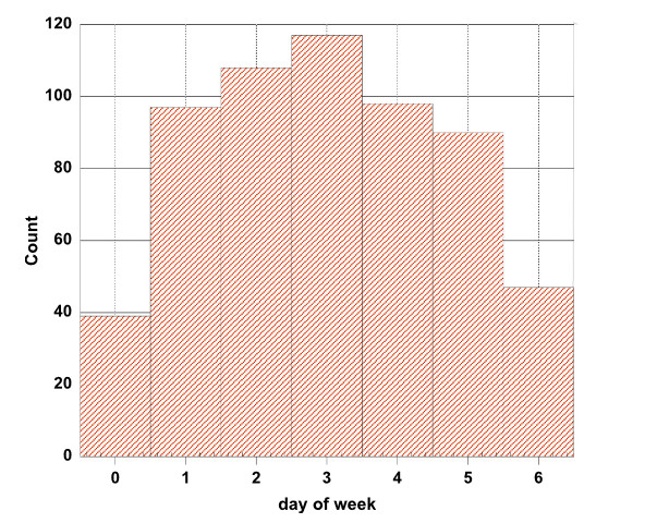 研究人员收集了在2013年和2014年期间通过电子方式投稿至《塞尔维亚化学学会杂志》(JSCS,在2012年的影响因子为0.912)的文章情况,收集到的文章总数为596篇。下图是JSCS期刊在2013年至2014年期间收到的所有按星期分类的SCI稿件数量。