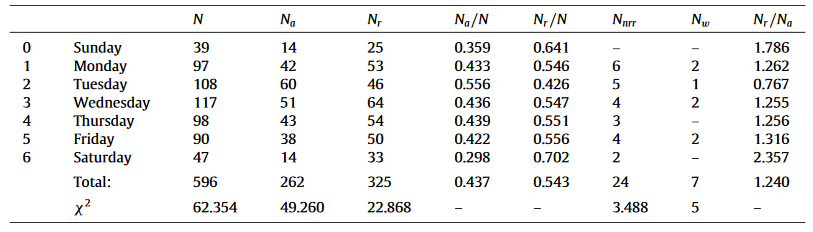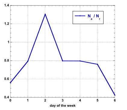 此外,在得出上图之后,研究人员又使用“Na/Nr”作为“接受/拒稿率”对“周二效应”形成了直观描述,如下图所示。