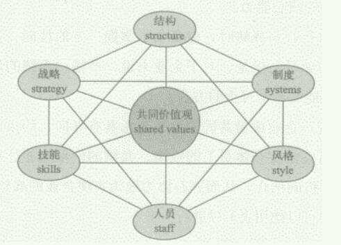 7S是指结构(structure)、制度(systems)、风格(style)、员工(staff)、技能(skills)、战略(strategy)、共同价值观(shared values)。