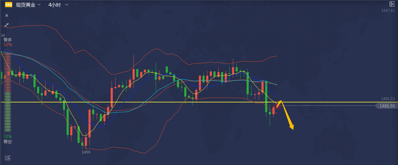 黄金4小时我们来看一下,上周尾盘一路的下跌直至收盘阶段出现一波反弹,但整体的弱势没有改变。黄金目前受压于5日均线,同样的周五收盘反弹的位置即是顶底转换前期压力1489~1490附近。1490这个位置没有上破,那么行情依然保持一个弱势的下跌,在此位置周一开盘我们可以介入空单,防守位置1495,目标看至1474一线。