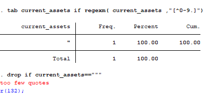 如下图,使用如下命令发现nonnumeric数据时,显示包含双引号”的数据,但我用drop命令删掉时,却返回too few quotes.