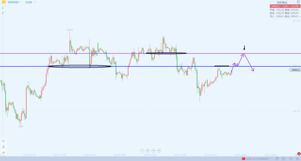 1:黄金1493先行做多,损在1488,目标看向1503.